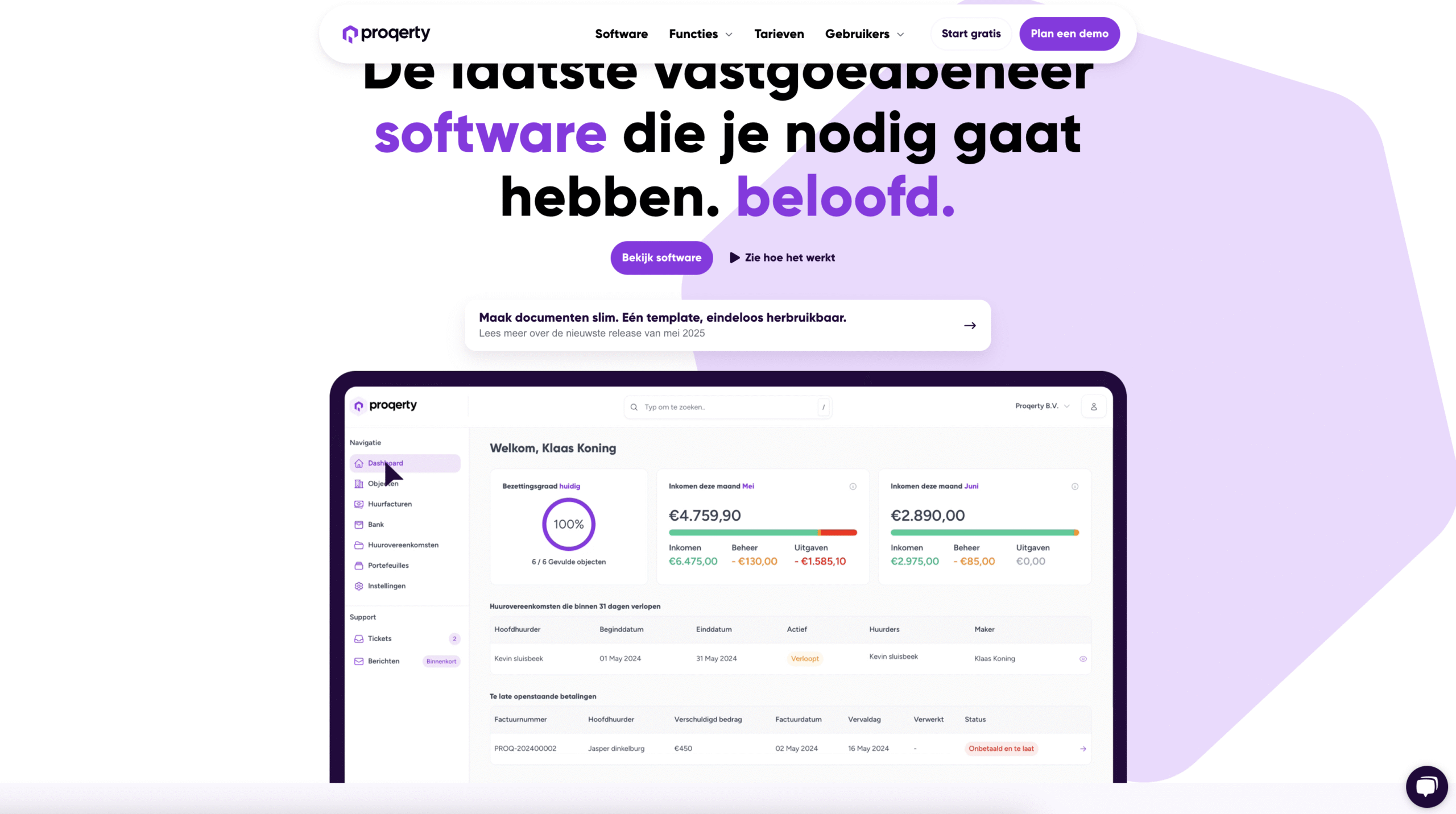 Proqerty positioneert zich als een eenvoudige maar krachtige tool voor vastgoedbeheerders, vastgoedeigenaars en huurders. Het platform focust op eenvoud en snelheid, zonder overbodige toeters en bellen.